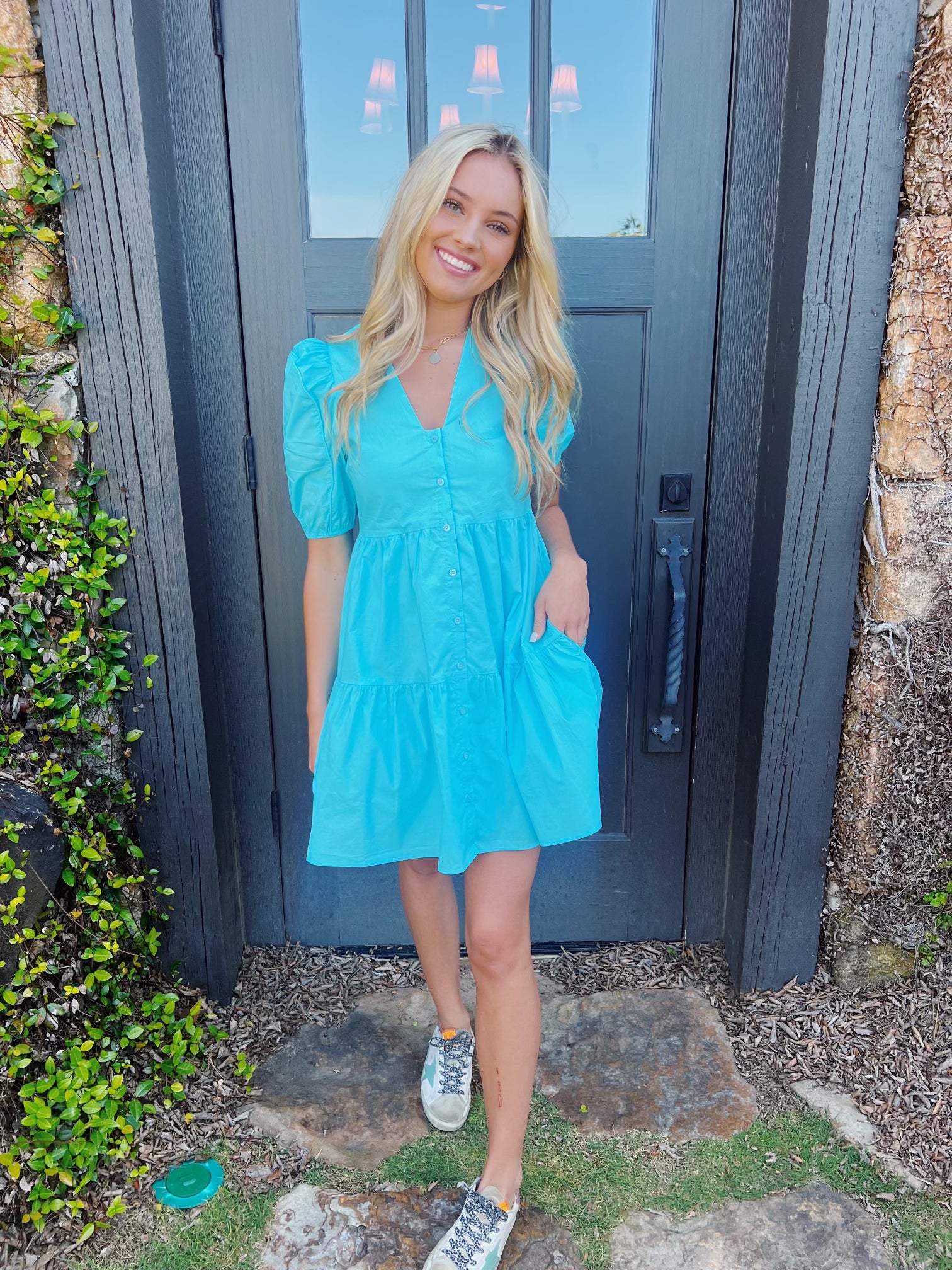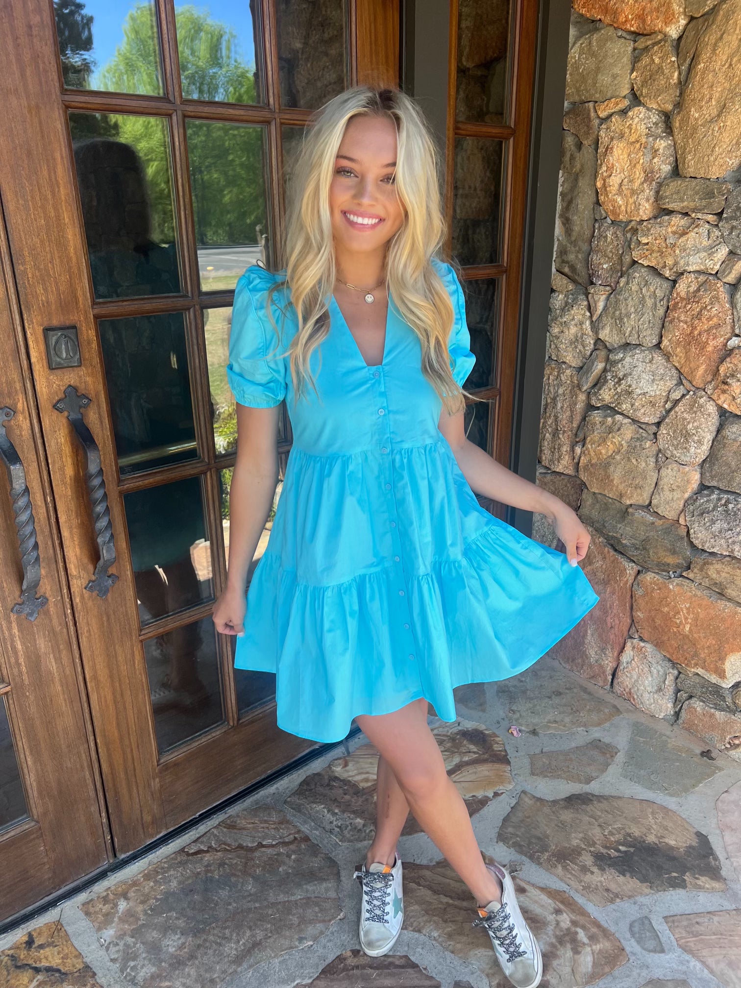 The most gorgeous blue babydoll dress with puff sleeves. There are buttons down the front and best of all, pockets!!! Dress has a relaxed fit that is perfect for dressing up or down! Model is wearing a small.