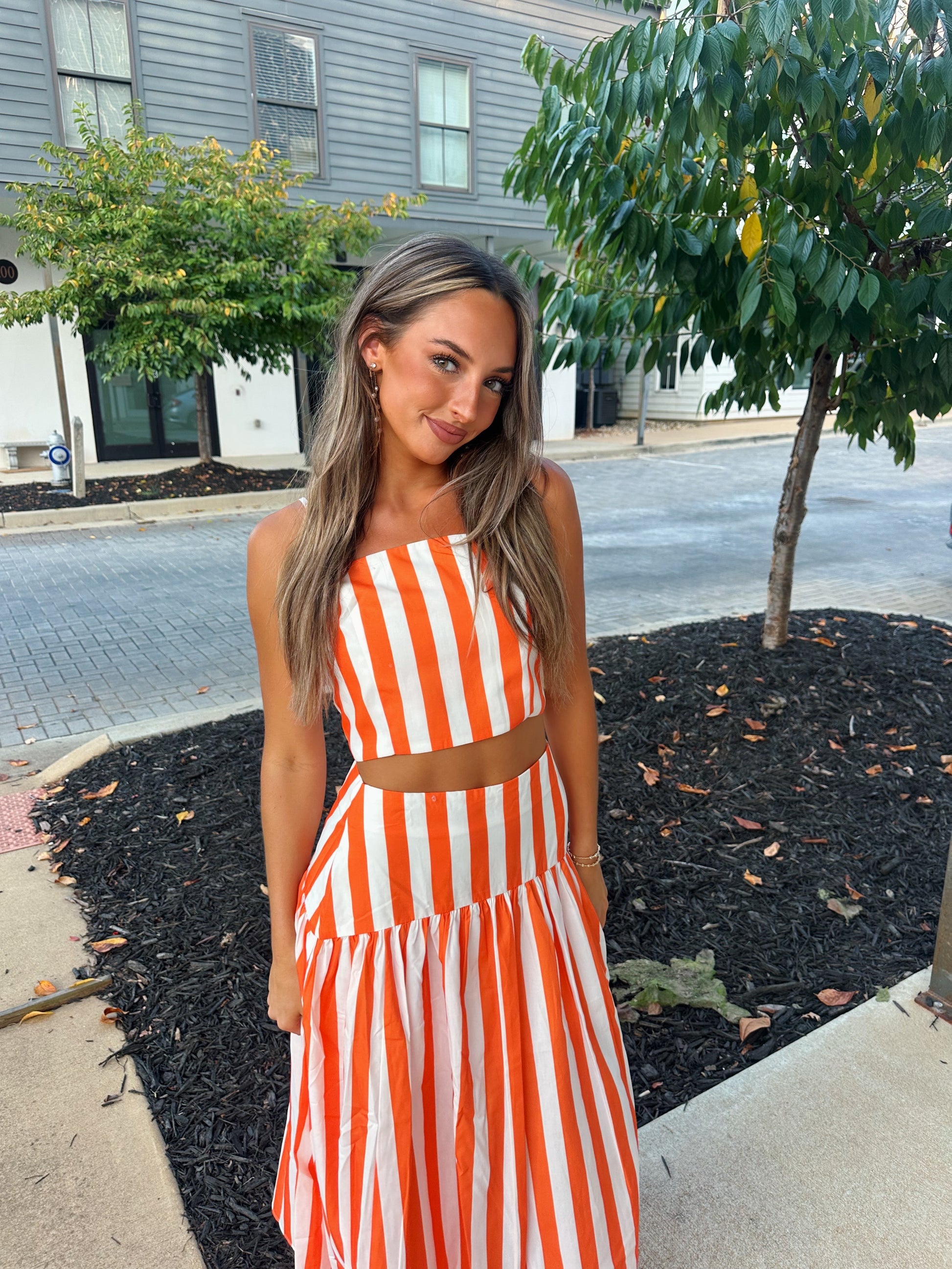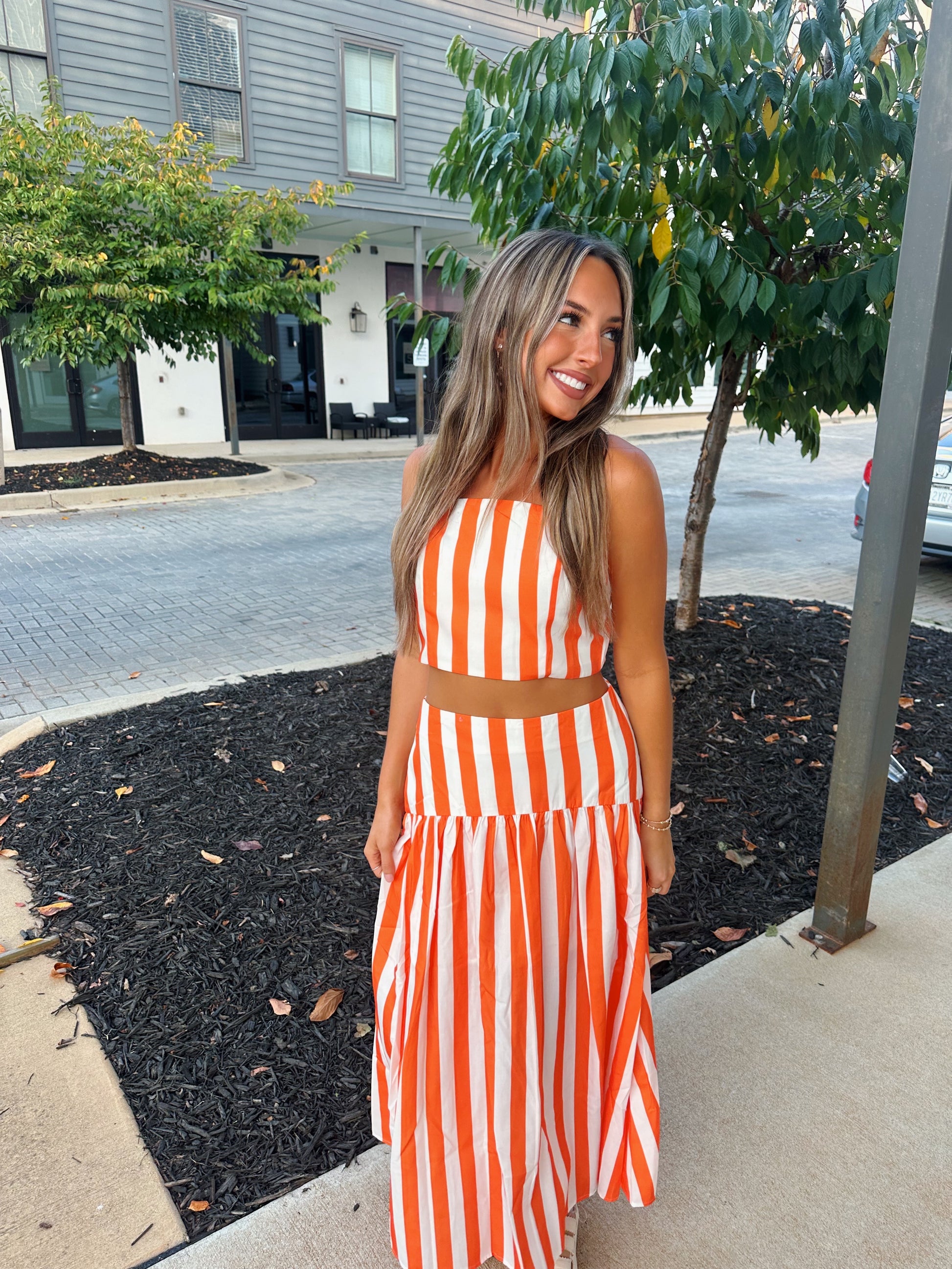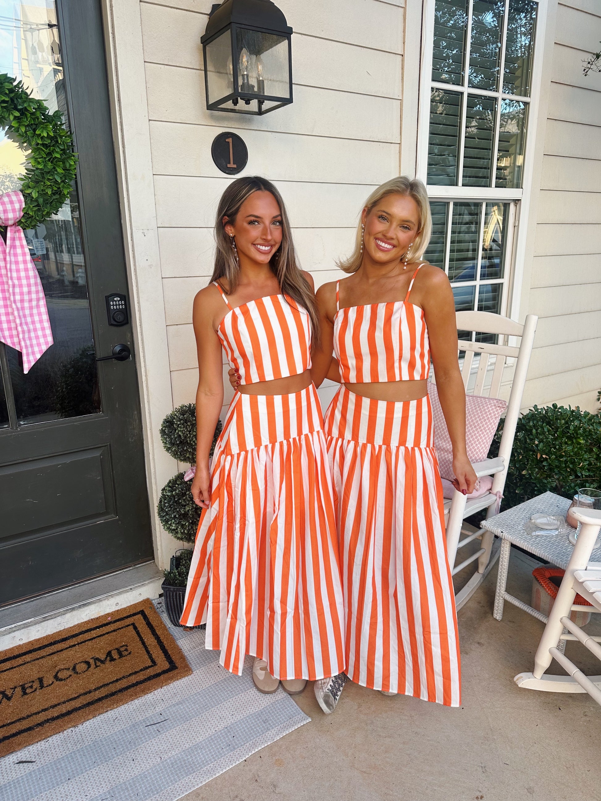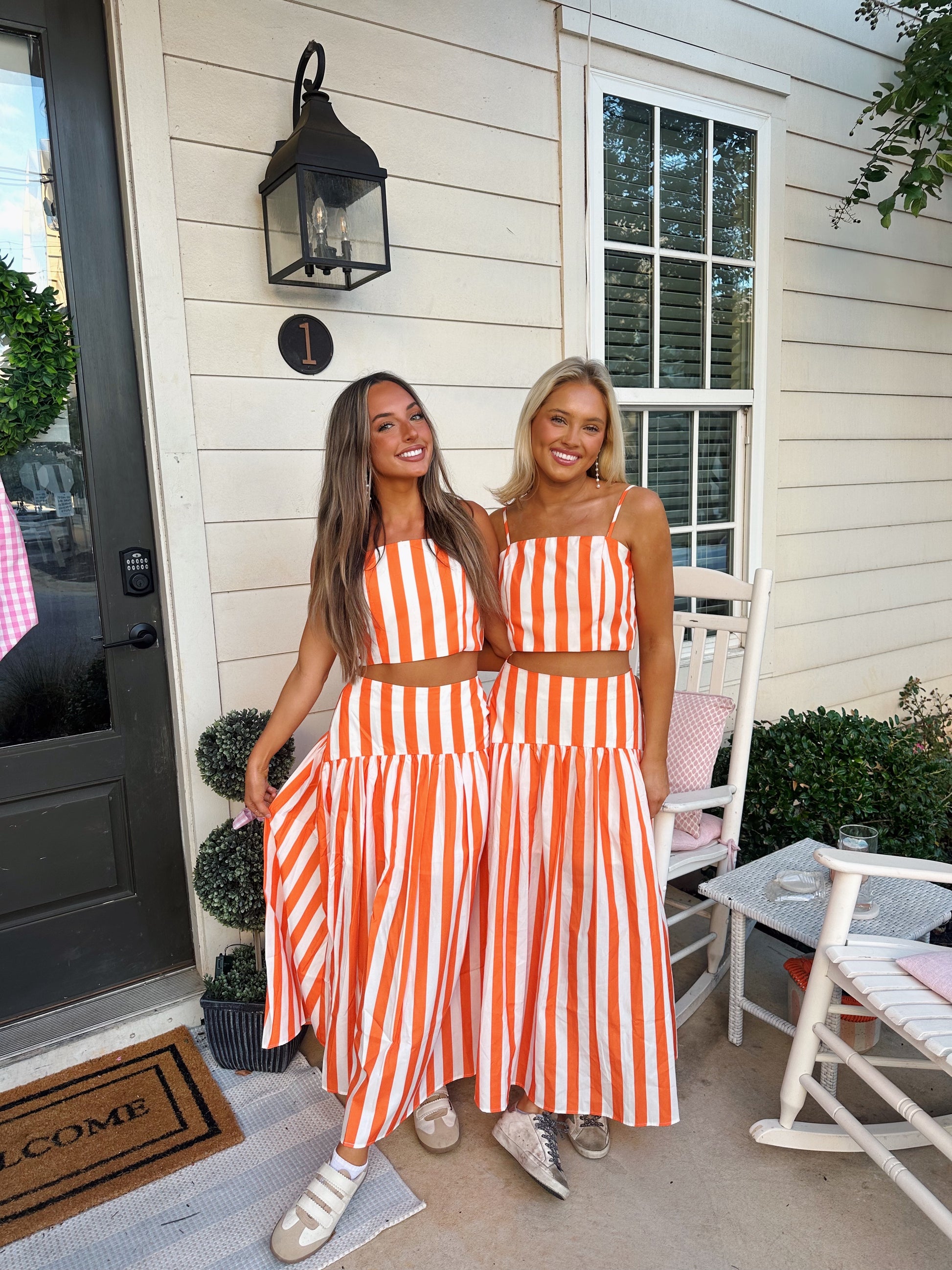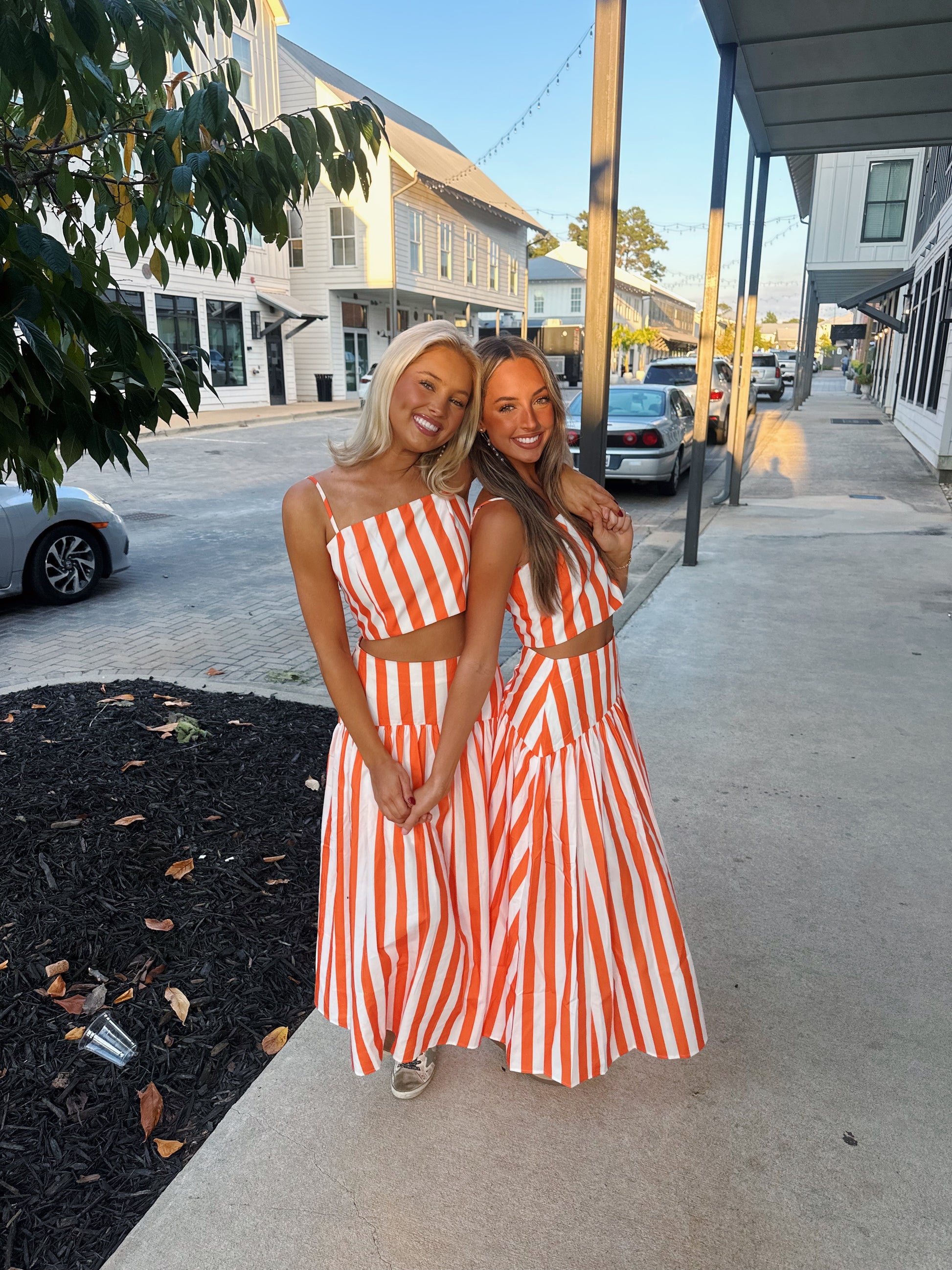 Orange striped set with adjustable straps and a zipper on the skirt! The skirt has a lining in it! Runs TTS. Models wearing smalls!