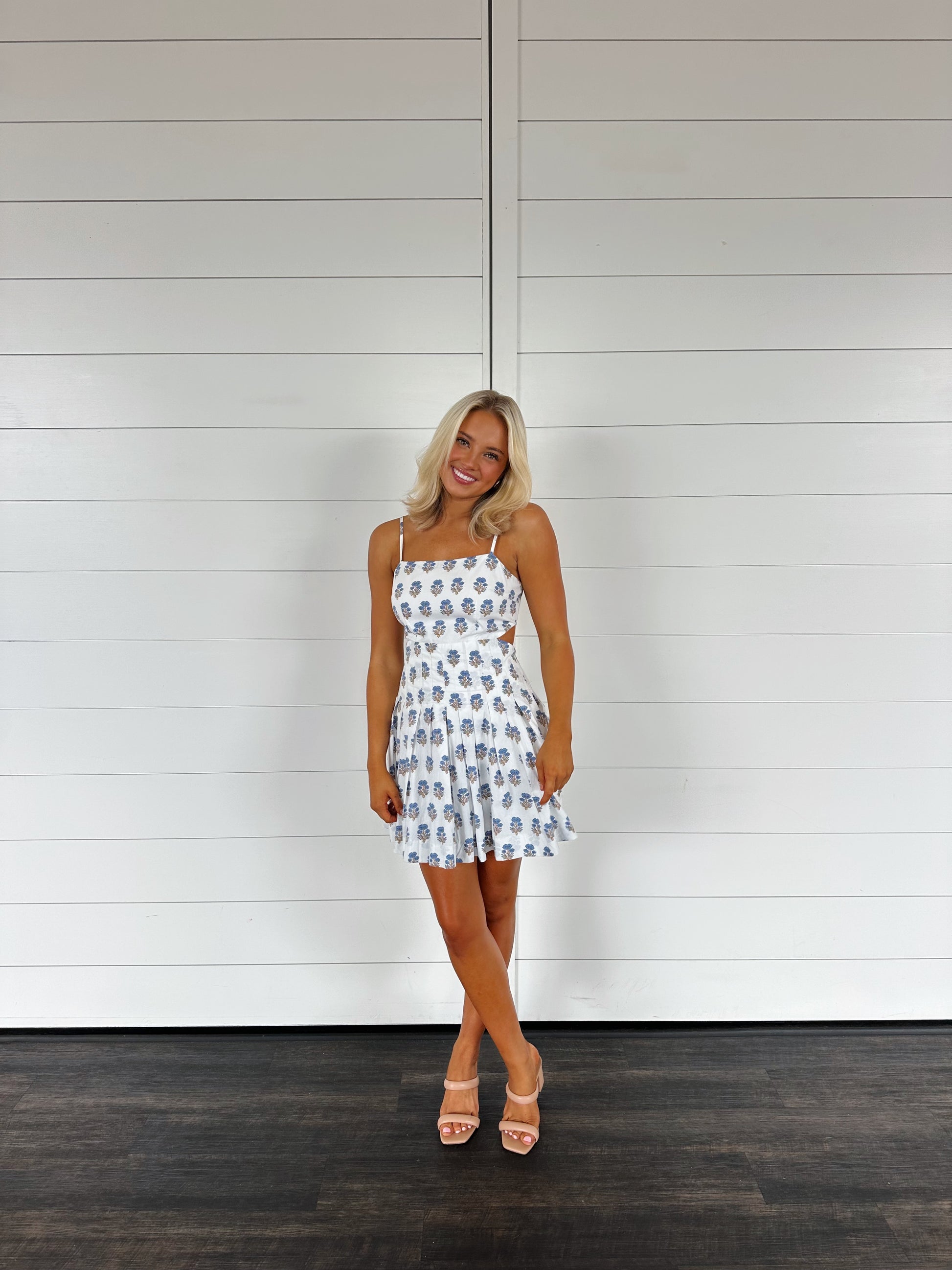 The perfect summer mini!! The straps are adjustable and the back zips & ties to your fit!! Fits TTS. Model wearing a small!