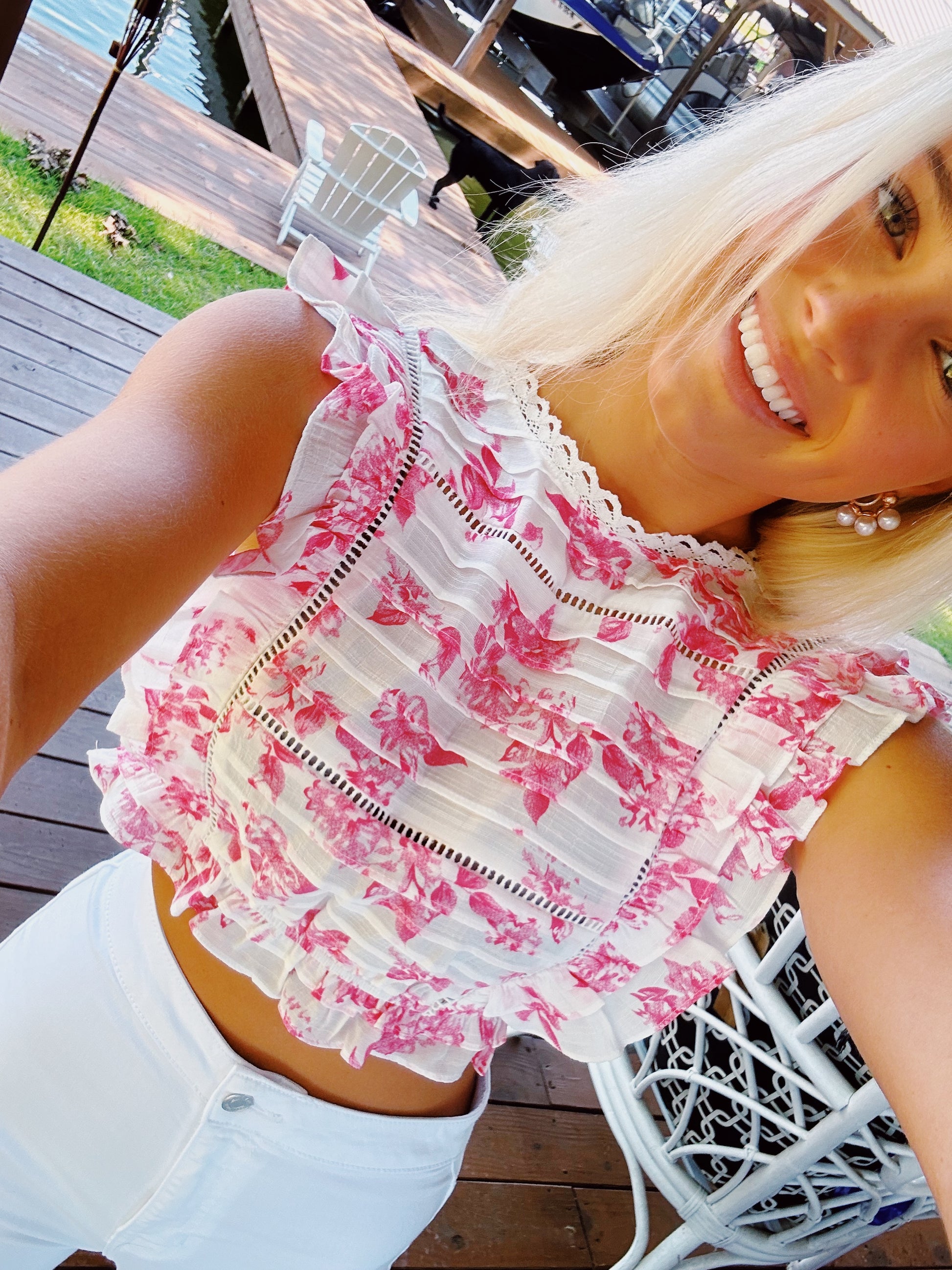 Ruffle floral cropped top with a button in the back. Fits TTS. Model wearing a small!!