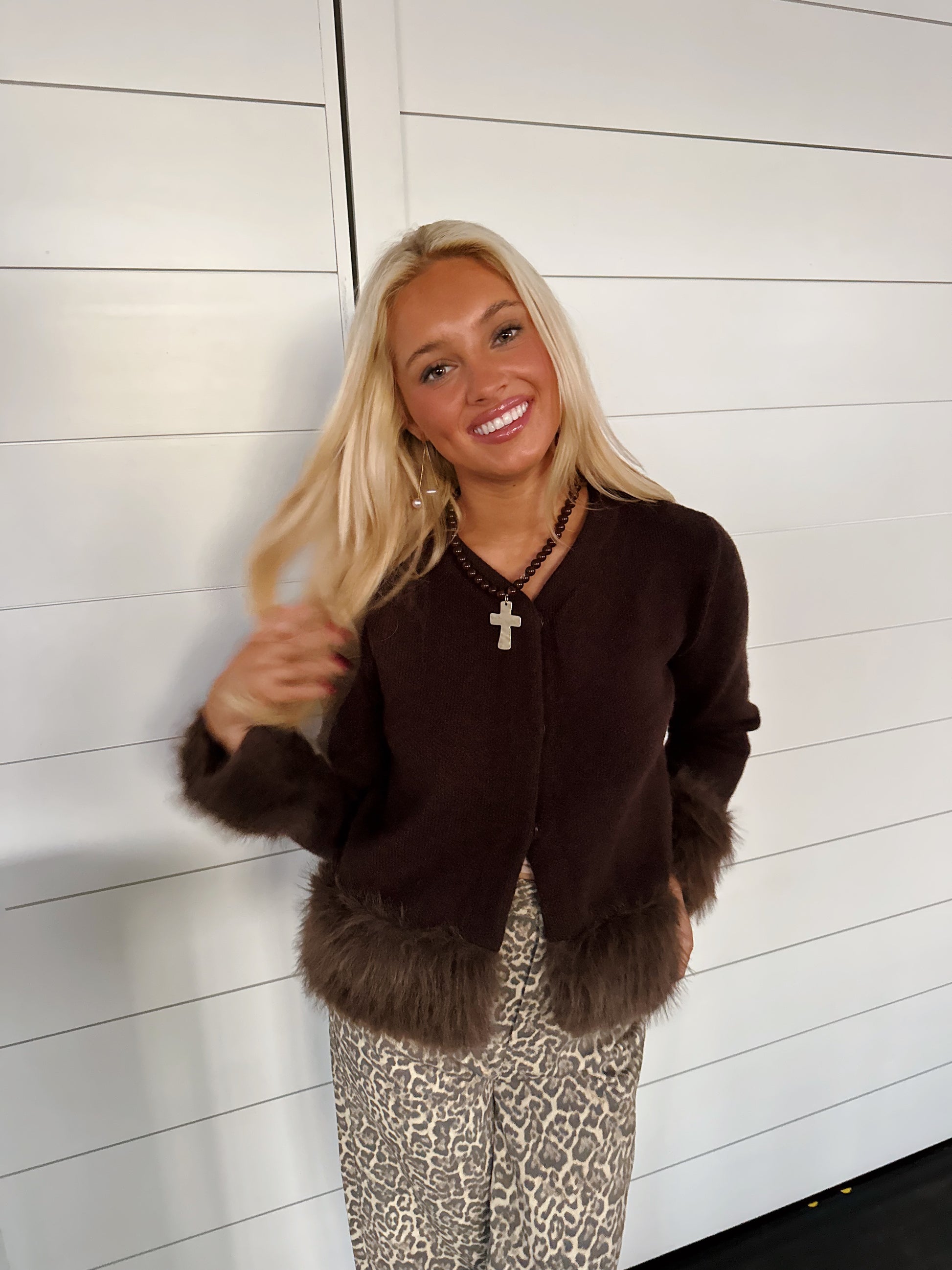 Brown beaded necklace with gold statement cross. Such a pretty piece and a fan favorite! (16”-18”)