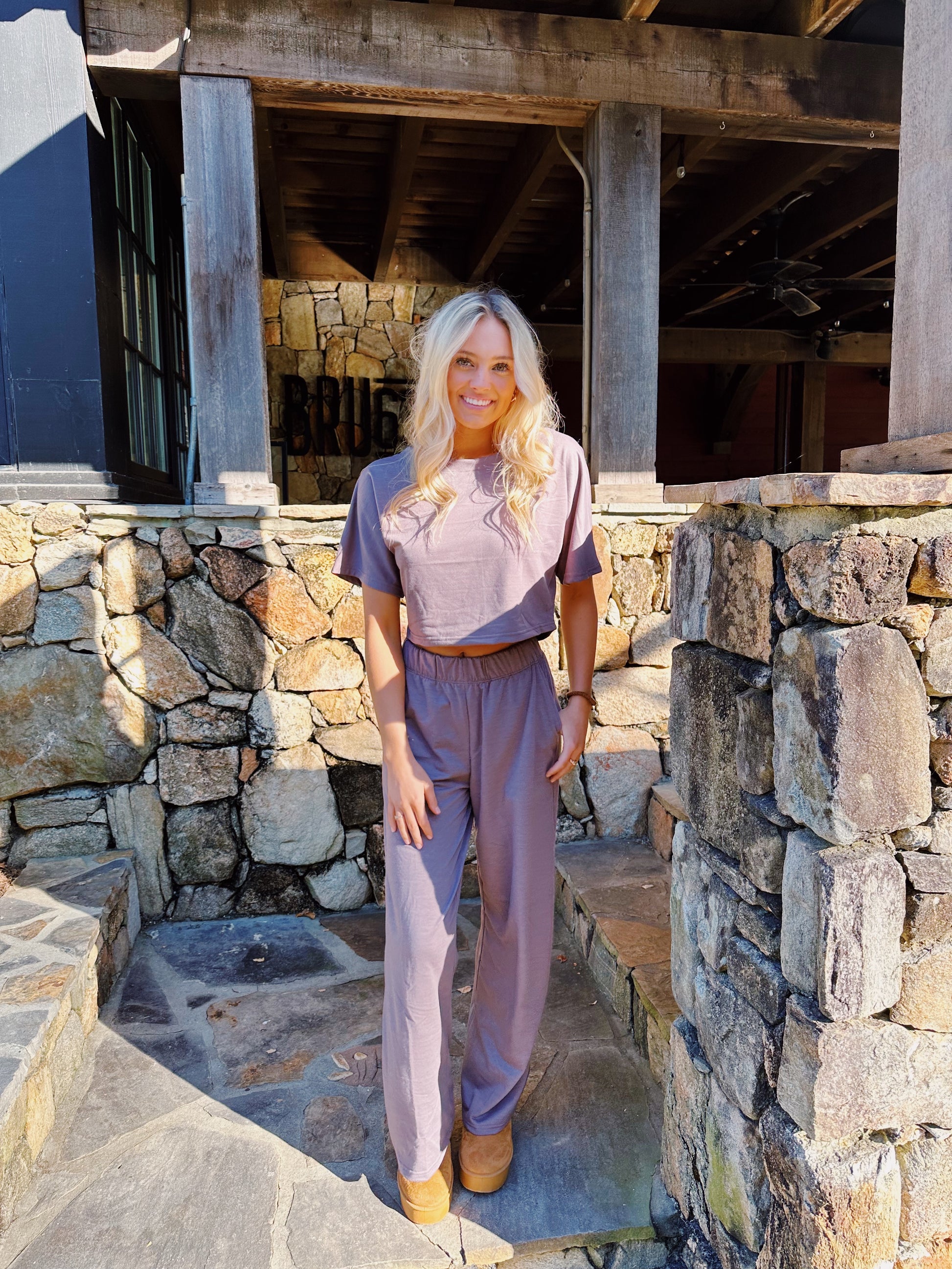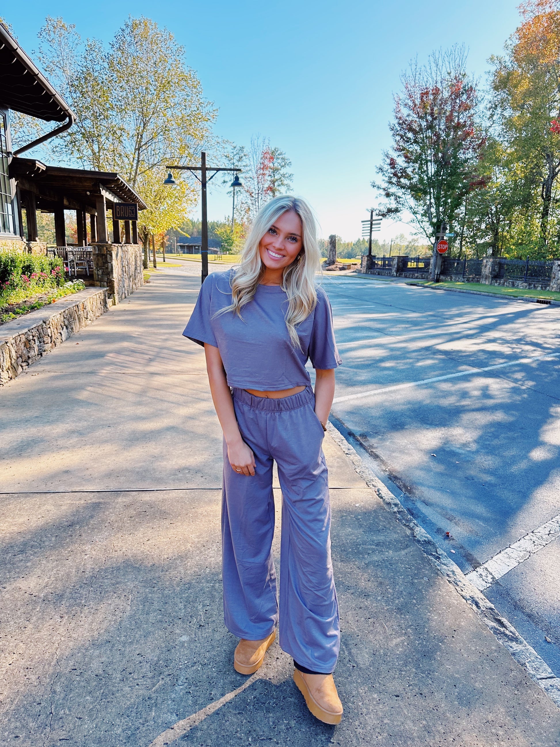 This set has a loose fit with a stretchy waistband and a loose neck fit. It also has pockets and is super comfortable. Fits TTS.