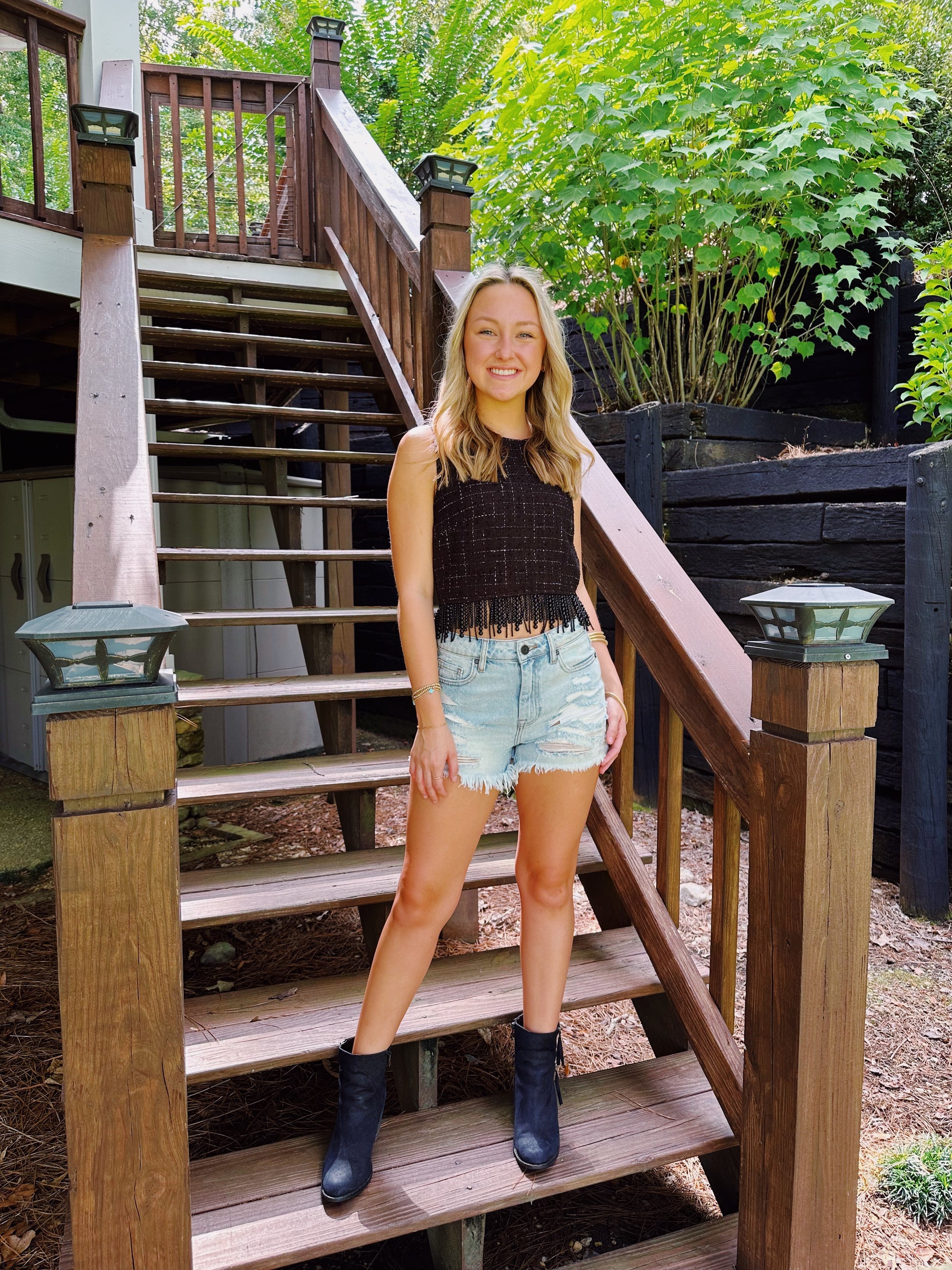 Such a fun top! Black top with beads on the bottom and zips on the side. Fits TTS, model wearing a small!