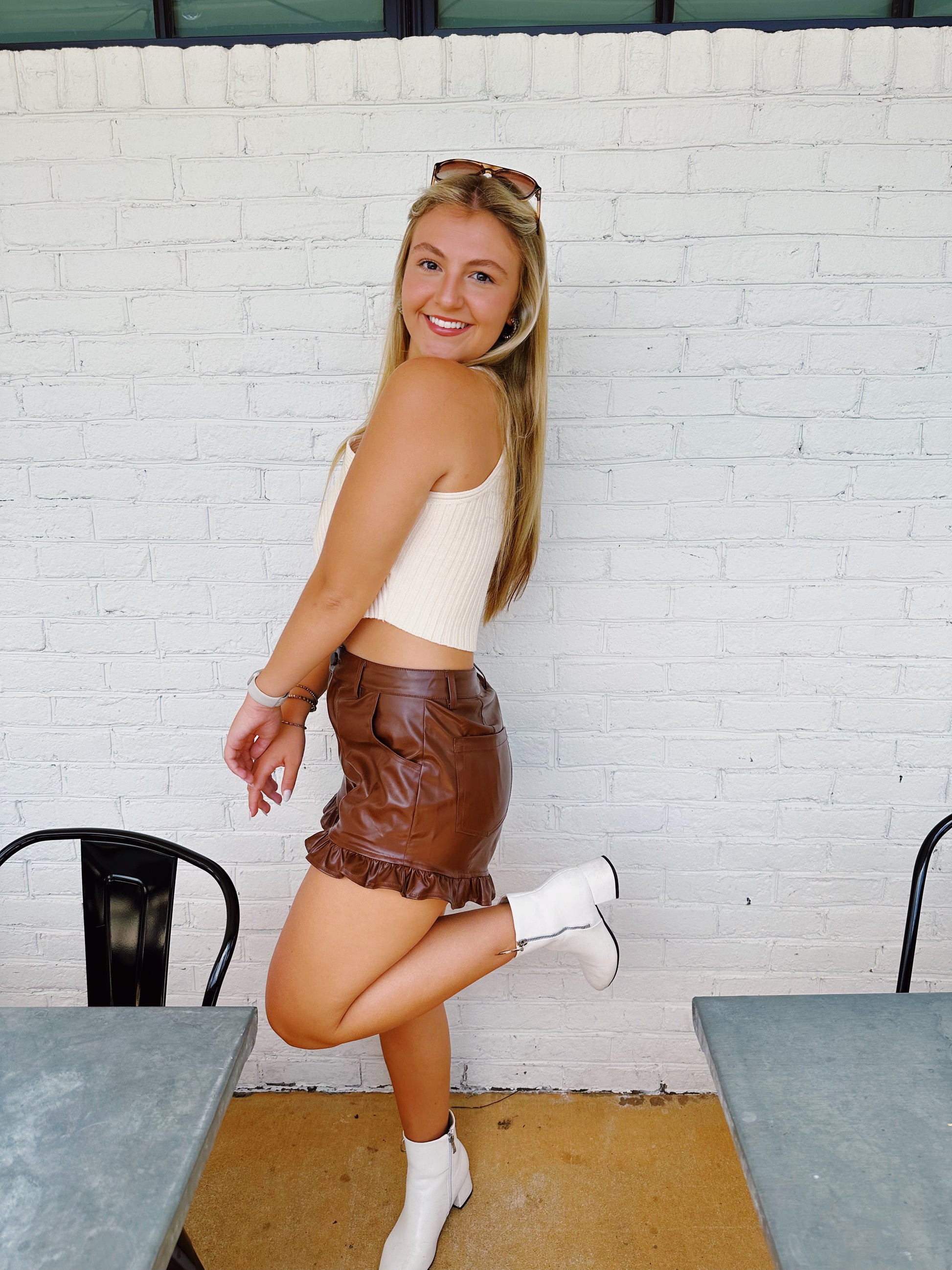 The perfect shorts for fall! These faux leather shorts have ruffles on the bottom and run true to size! Model wearing a medium.
