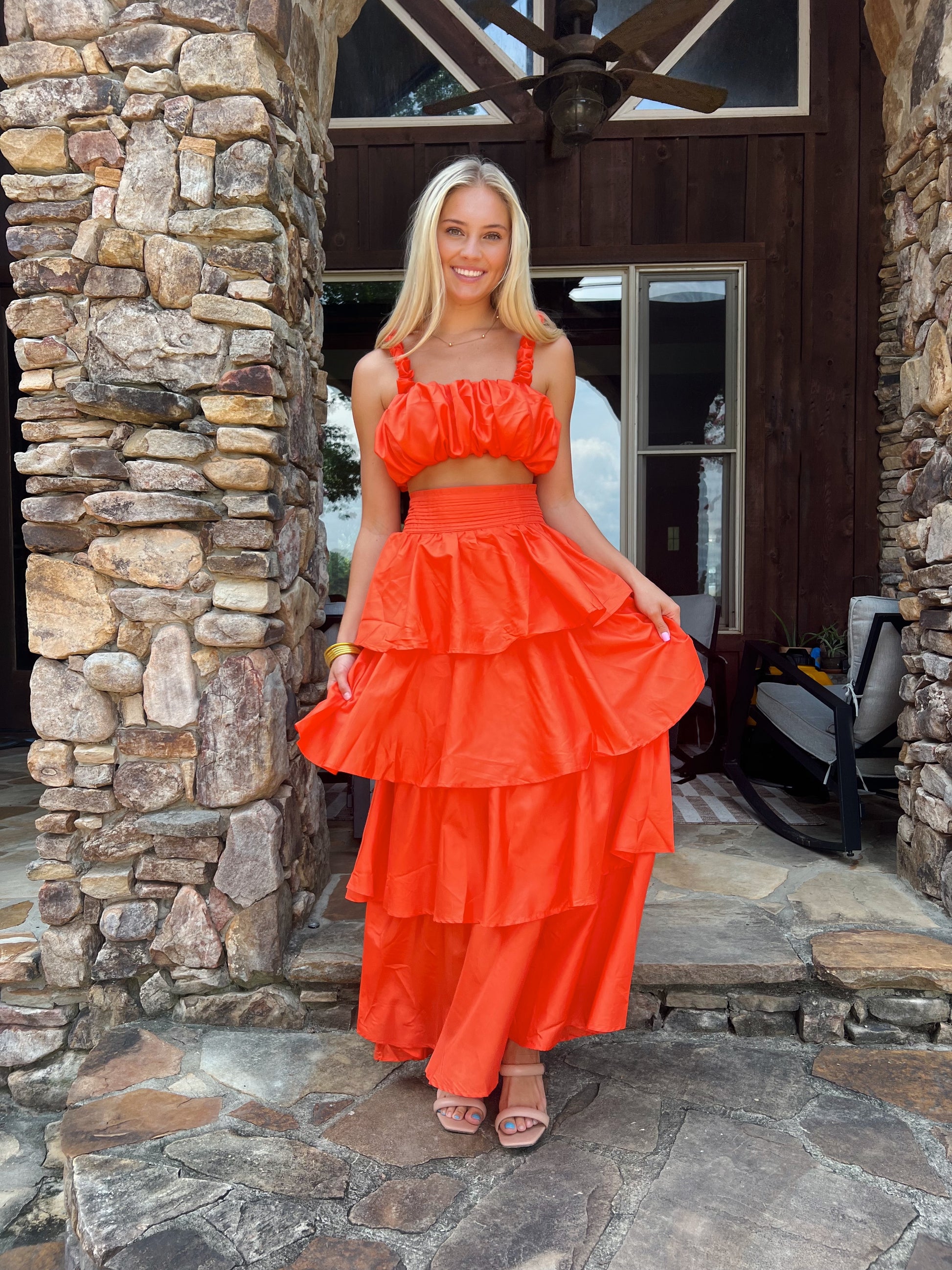 This ruffled maxi skirt and crop top is so much fun! The skirt zips in the back. The skirt runs big and the top has a stretchy fit.