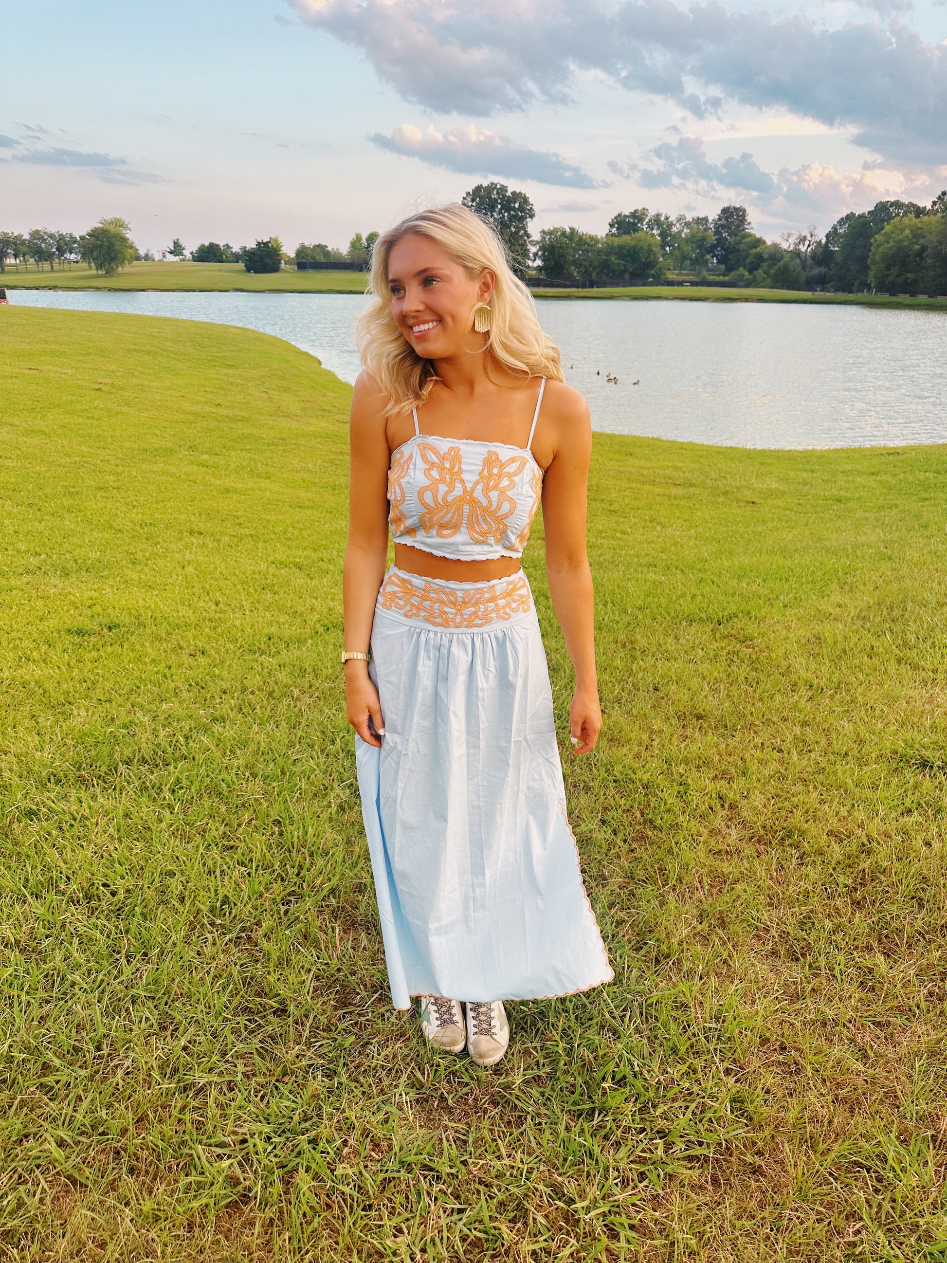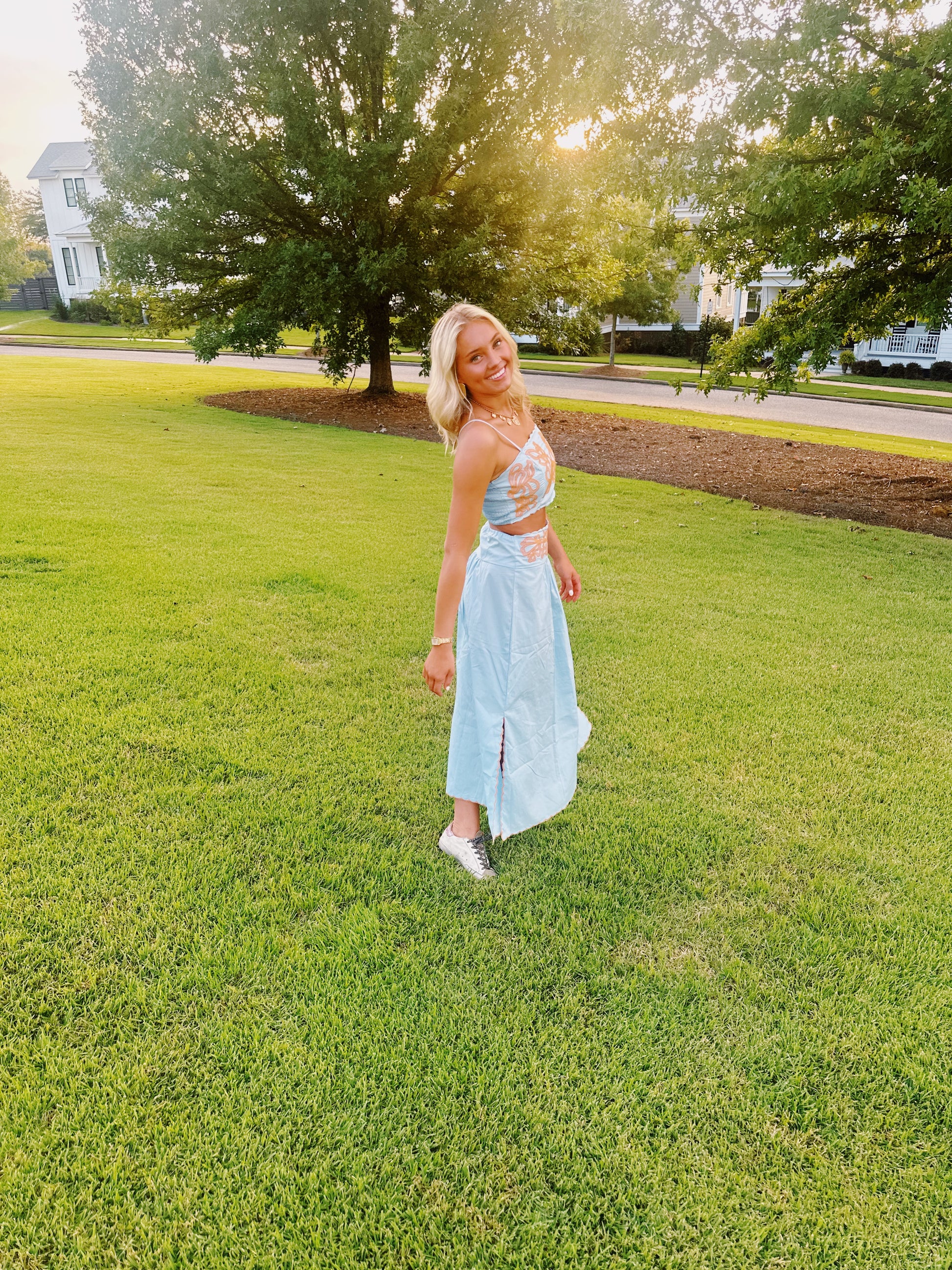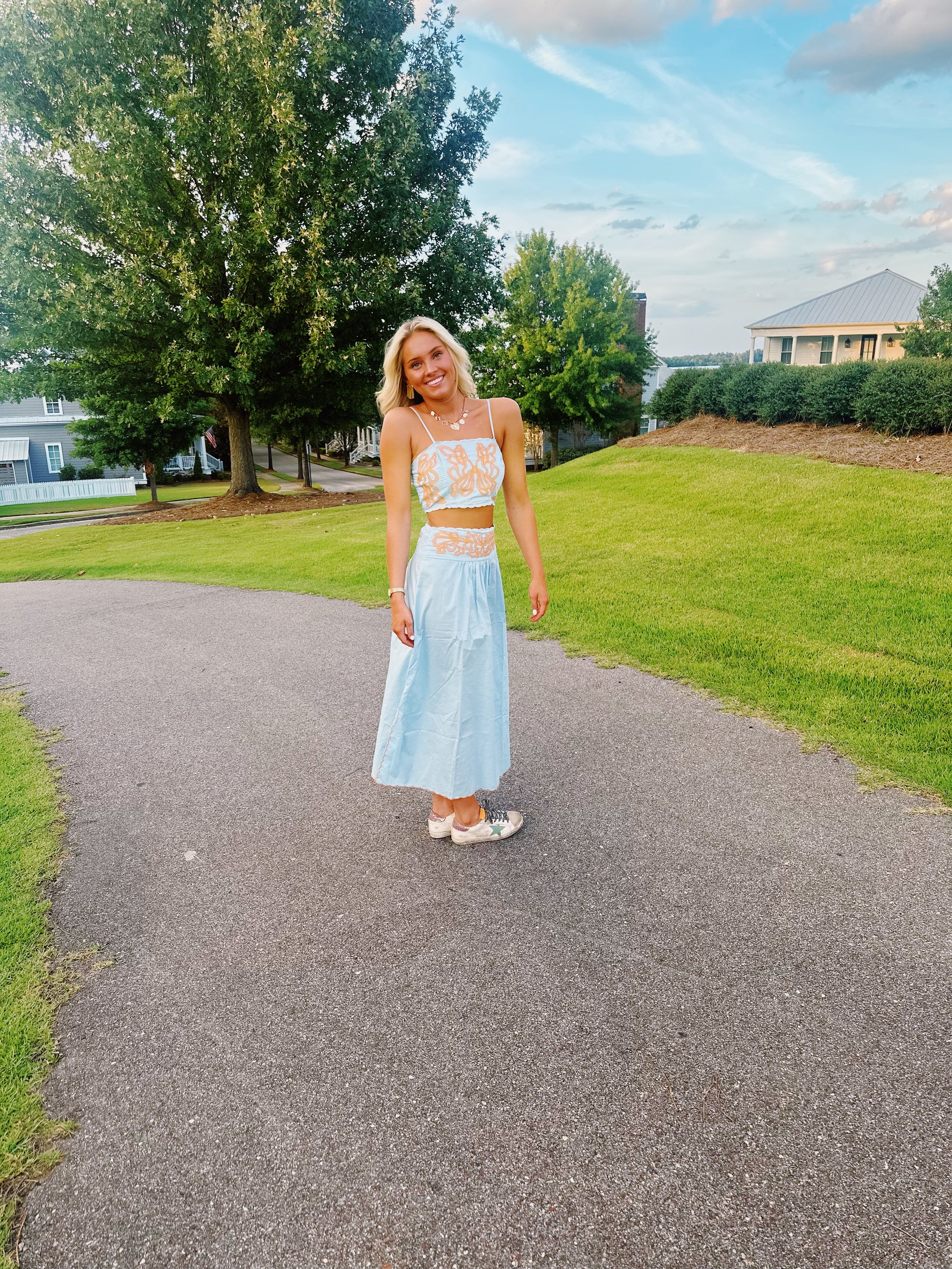 The most perfect detailed set! Top is stretchy with spaghetti straps. Skirt with a zipper and size slit. TTS. Model wearing a small!