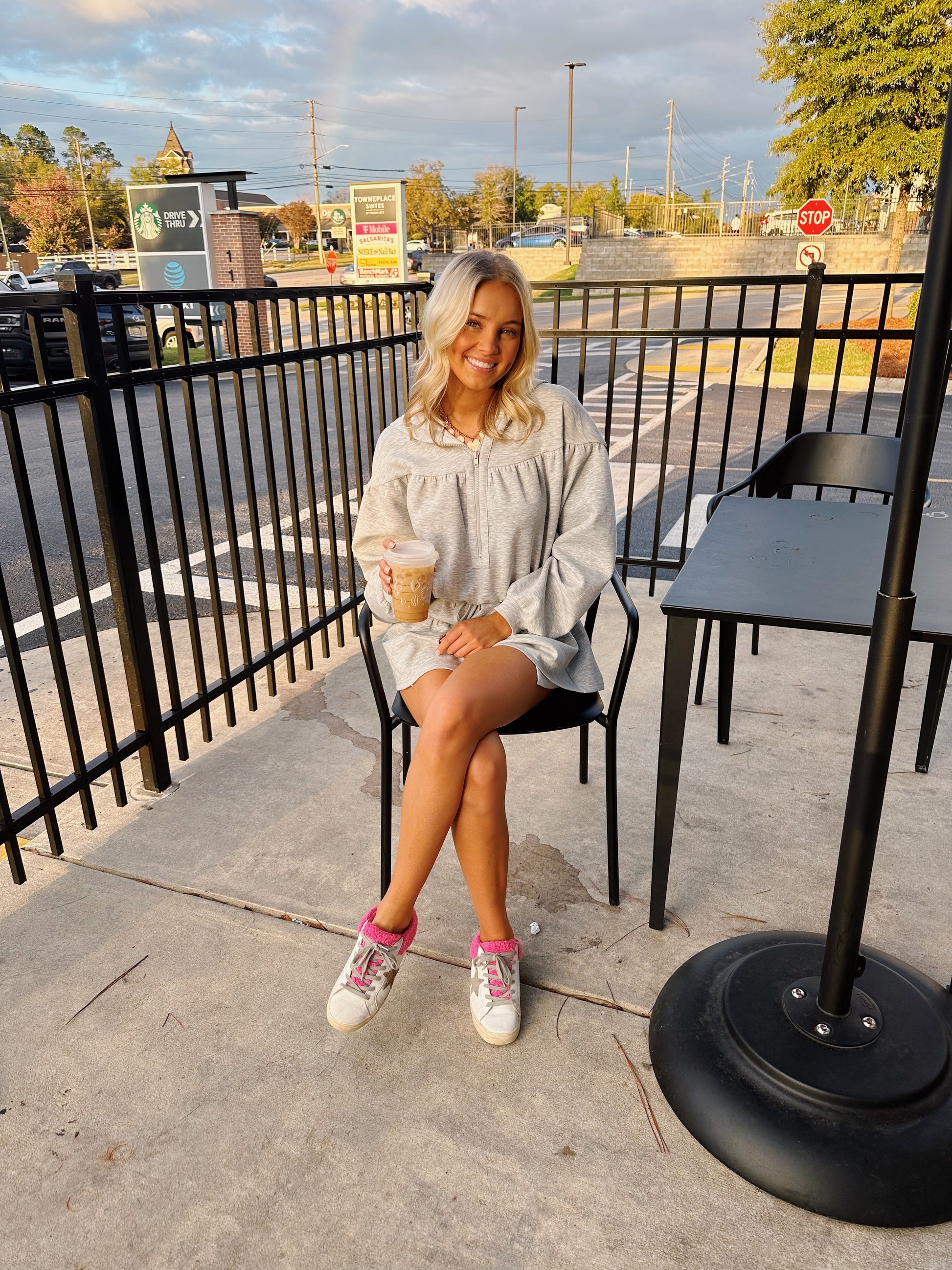 This romper is soft + comfy!! It has a front zipper, a hoodie, & an elastic drawstring waistband. Dress up or down! Model wearing a small- normally a small/xs but i rolled it at the waistband because it was big on me! Stock pic included!