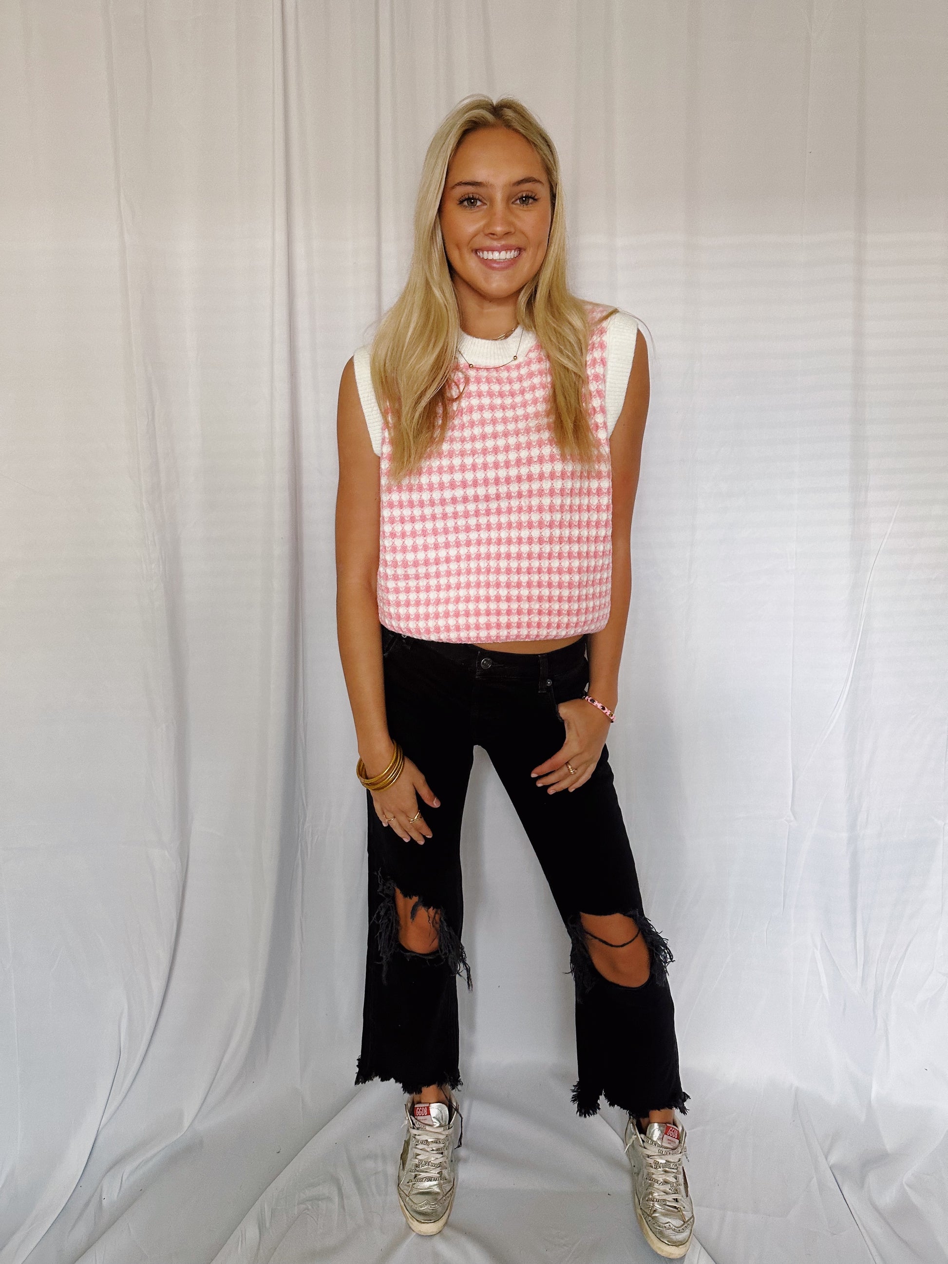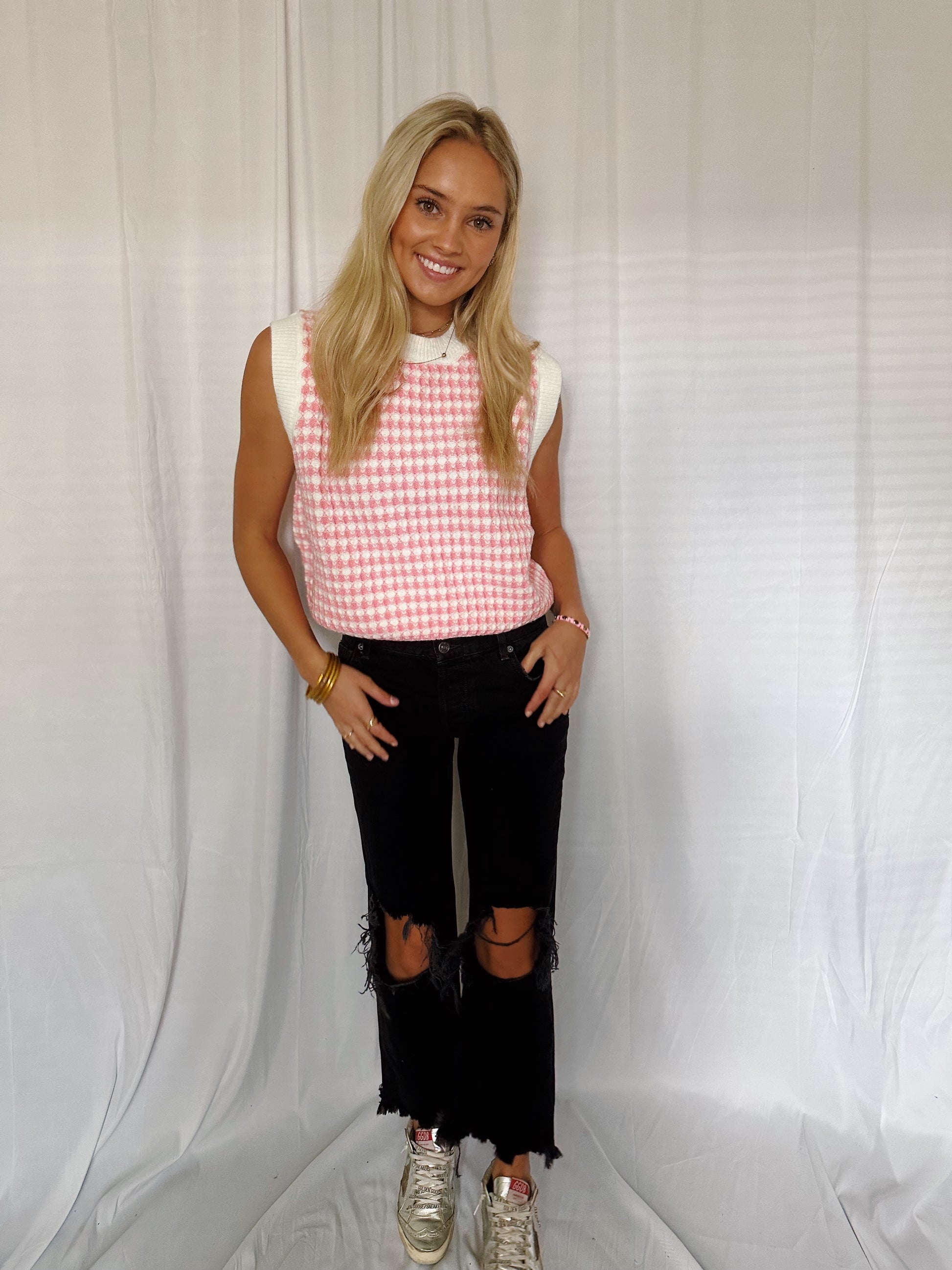 This pink and white shirt sleeve sweater has the best material. It has a white trim around it. It fits TTS! Model wearing a small.